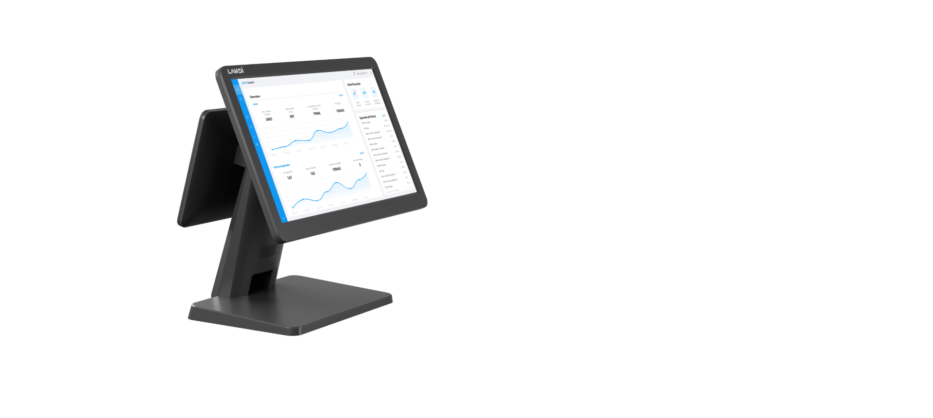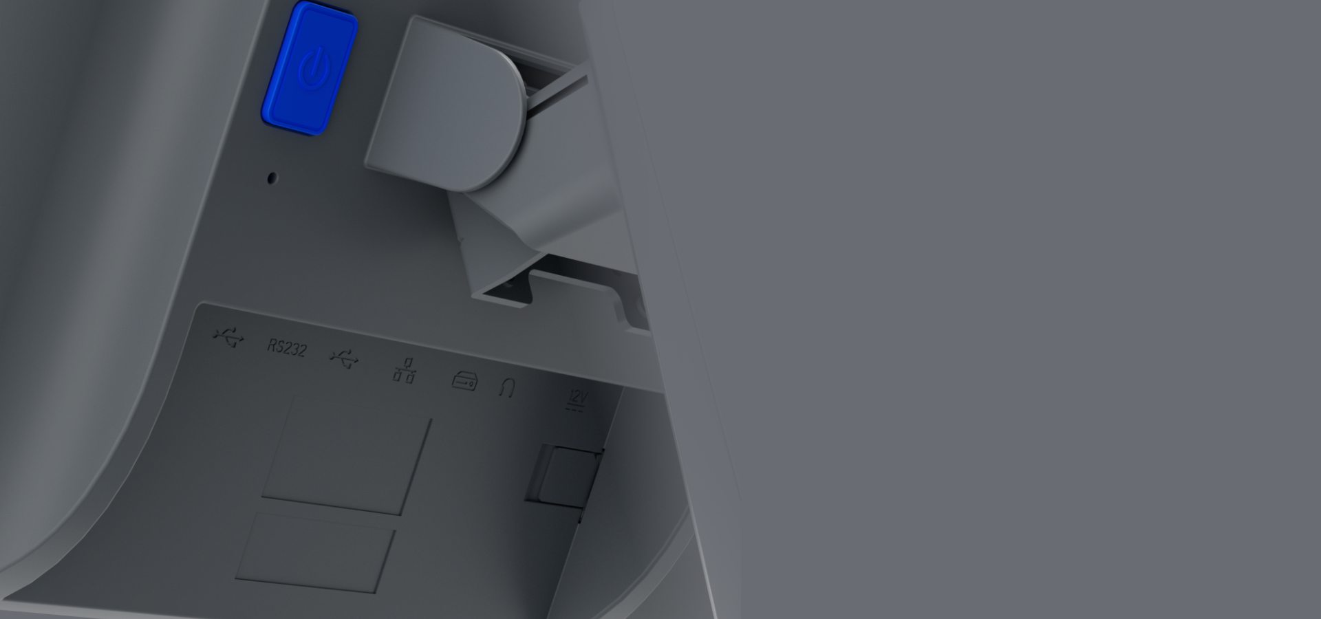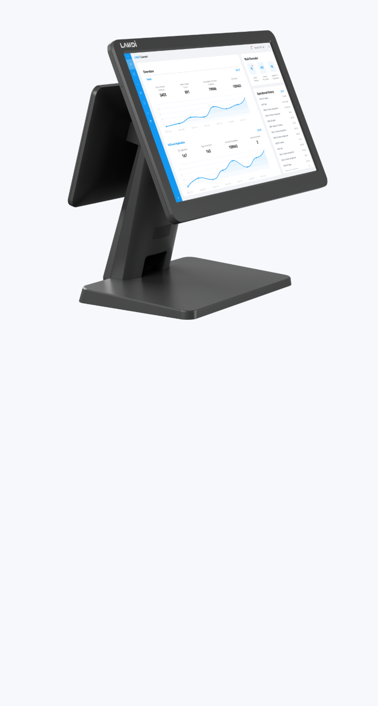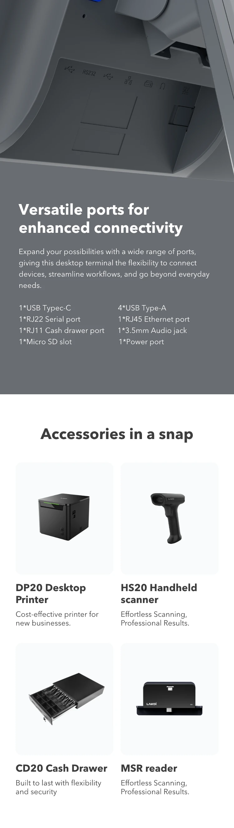 4*USB Type-A 1*RJ22 Serial port 1*RJ45 Ethernet port 1*RJ11 Cash drawer port 1*3.5mm Audio jack 1*Micro SD slot 1*Power port |